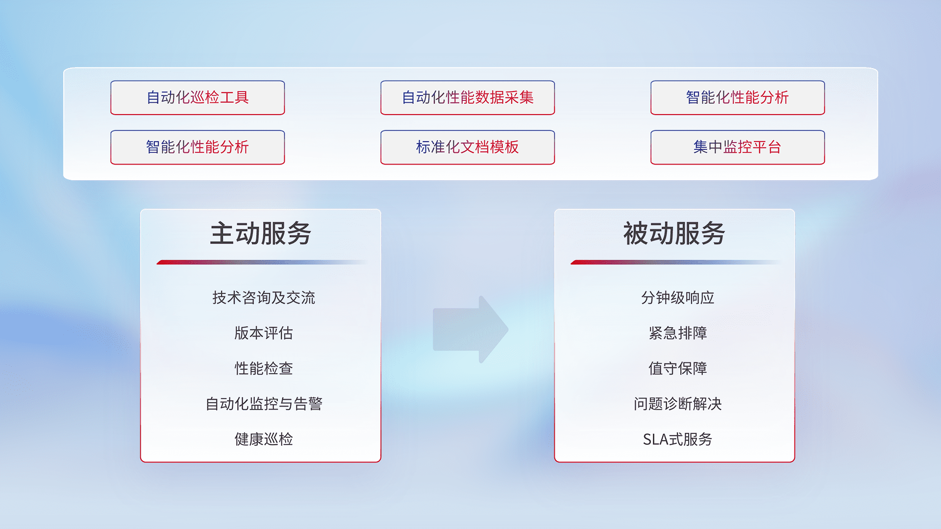 智能化工具和标准化文档,,,保障服务质量,,,提供主动服务(包含技术咨询、、、、版本评估、、性能检查、、自动化监控与告警、、健康巡检)和被动服务包含(分钟级响应、、、紧急排障、、、、值守保障、、、问题诊断解决、、SLA服务)。。。
